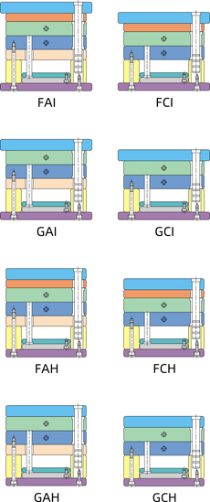 简化型细水口(又称双/多分型面模架), 是细水口模架之简化版本, 标准长阔规格由150mm x 150mm (简称1515系列) 至500mm x 700mm (简称5070系列); 简化型细水口模架少了四组拉杆, AB板导柱亦改为四组长导柱, 由水口板延至方铁。模架分为 F 型及 G型两大类, F型有水口推板而G型则没有, 由于A板及B板之间没有推板, 故只有 A及C两个型号, 加上只有工字模 (I型), 直身模 (H型) 两类, 共有 8 种不同型号规格, 模具制作者可因应产品要求而配置不同之板厚组合。